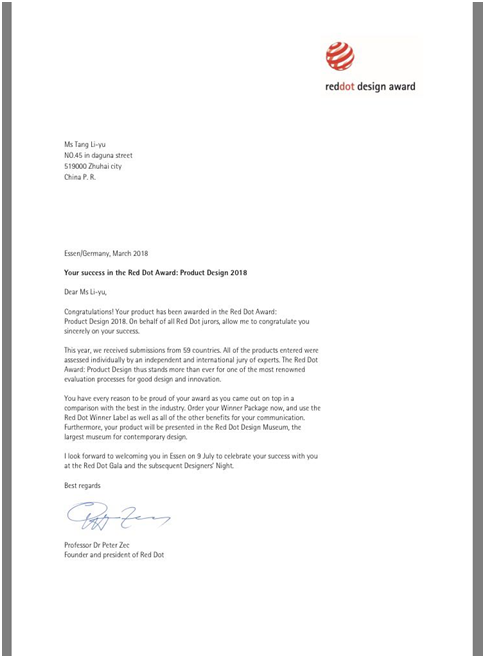据了解,荣获红点设计大奖的作品将得到在德国Essen的红点博物馆展出的机会,汤黎宇老师也将受邀参加颁奖典礼。